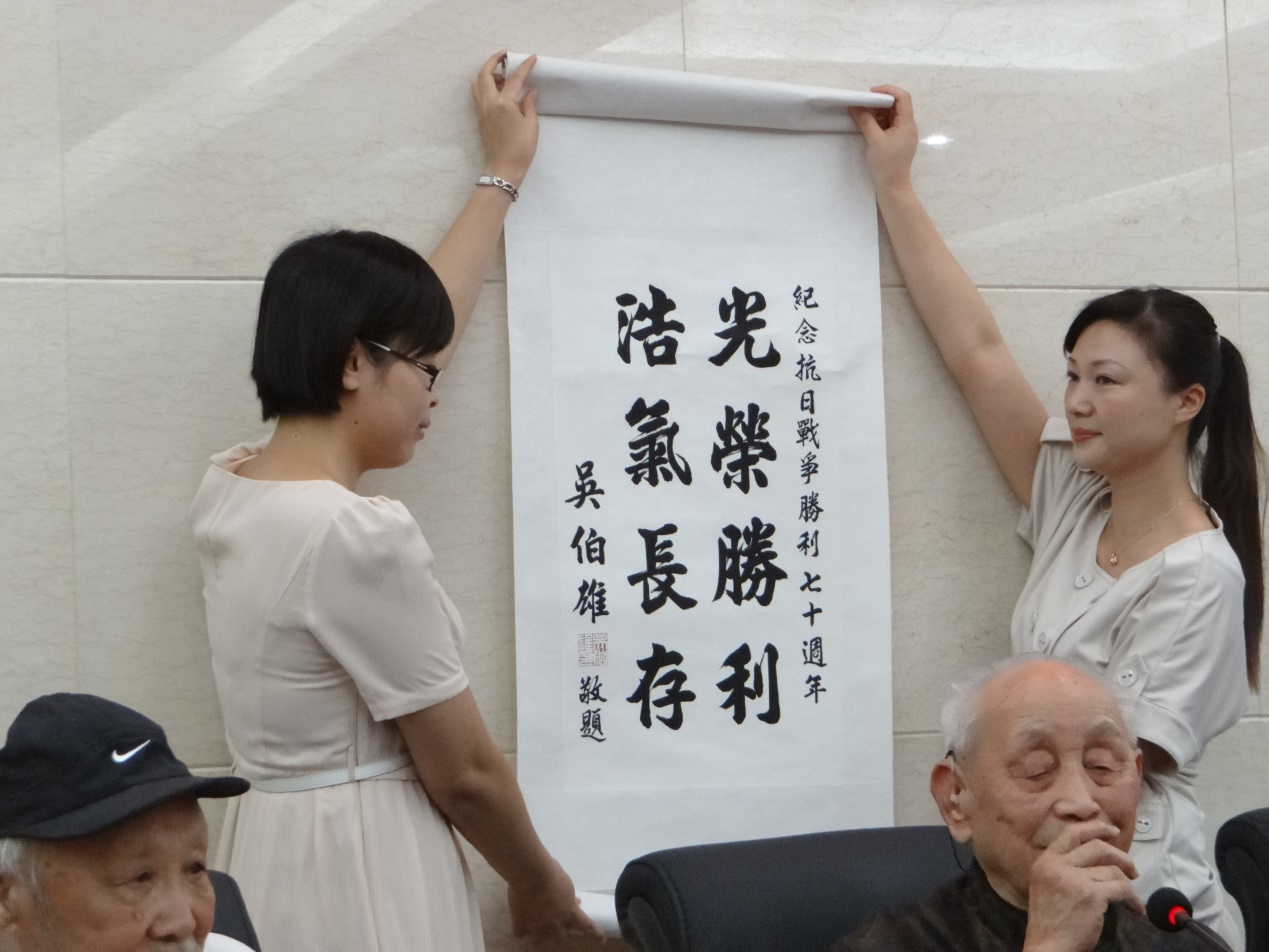 三位老兵的現身說法就是活歷史,但兩岸遭此苦難,上過戰場的老兵也正逐漸凋零。除了感謝他們曾做出的貢獻,體會他們所受的苦難,只能祝福這些老人家能夠頤養天年,幸福快樂過日子。會中台辦還展示國民黨榮譽主席吳伯雄先生為紀念抗戰勝利七十周年的敬詞,就是「光榮勝利,浩氣長存」。最後為老英雄們獻上鮮花,表達無比的敬意。